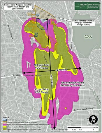 In 2020, Northrop Grumman agreed to a $104 million settlement – part of a massive $406 million settlement also including the Navy, the largest in state history – to remove the plume from Long Island aquifers. By then, the plume already measured more than 4.3 miles long, 2.1 miles wide and as deep as 900 feet; it’s now estimated that while most of the plume will be removed within 25 years, full remediation could take up to a century.