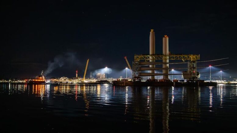 The enormous components of a Siemens Gamesa wind-turbine generator – including prefabricated towers, an enormous nacelle and three turbine blades, each longer than a football field – were loaded this weekend onto a transport barge, and on Tuesday were hauled away from Connecticut’s Port of New London by two U.S.-flagged tugboats.
