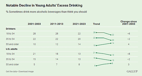 High and dry: Excess alcohol consumptions is already declining among younger Americans, who prefer pot. (Source: Gallup)