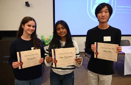 Brain matter: Adam Hong (right) took first place, Lauren Furer (left) took second and Taniya Raipatriwar took third in the 2026 Long Island Brain Bee.