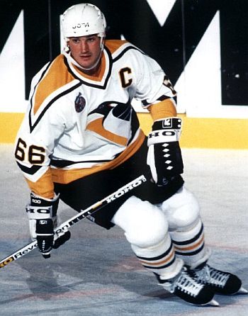 Stick figure: Lemieux, on ice.