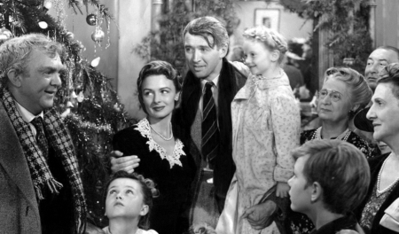 The richest man in town: George Bailey (James Stewart, center) first learned the meaning of Christmas 78 years ago tonight.