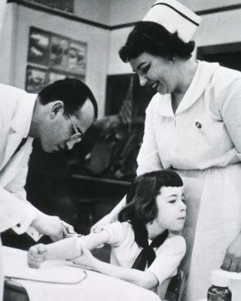 Stick figure: Jonas Salk inoculates a child with the polio vaccine in 1954.
